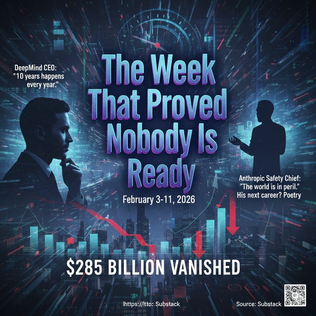 The founder of DeepMind just told us that one year in AI equals a decade of change. In that same week, Anthropic’s safety chief walked out, $285 billion evaporated from global markets, and the world’s